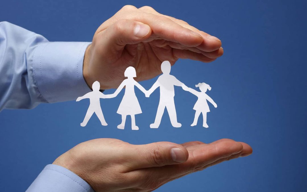 Dos manos que están por arriba y por debajo de una familia animada que se están dando las manos.