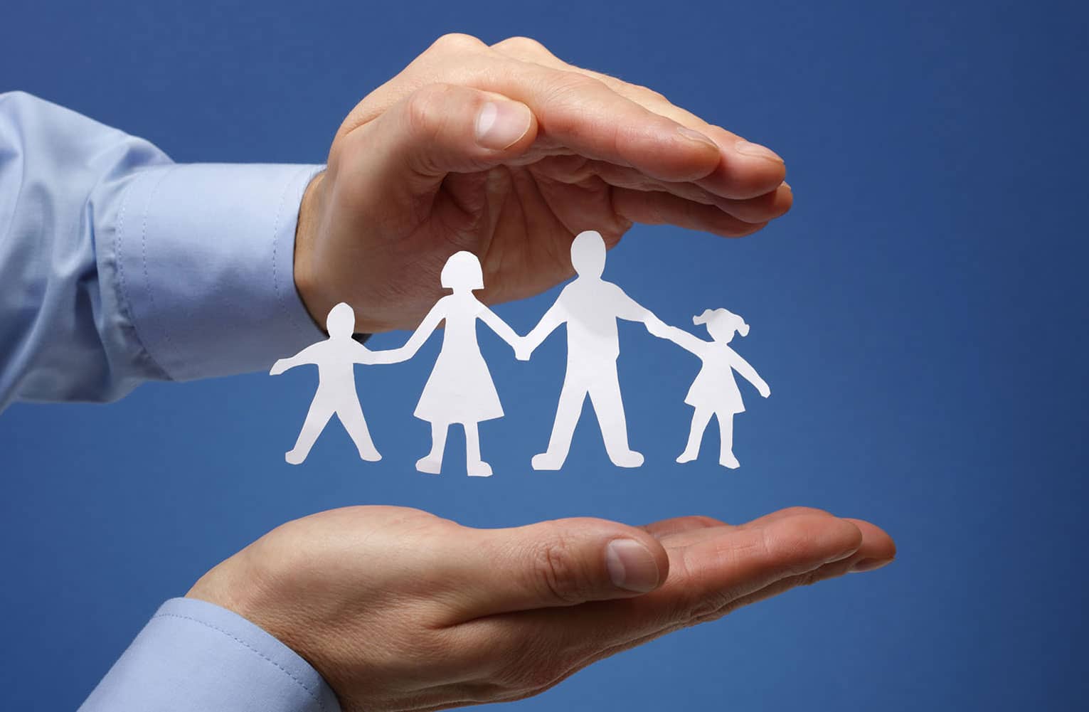 Dos manos que están por arriba y por debajo de una familia animada que se están dando las manos.