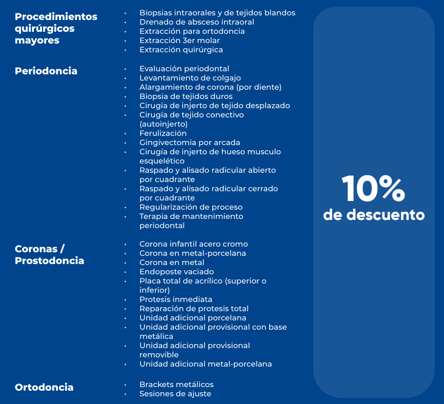 Entre ellos encontrarás descuentos de hasta el 70 % en servicios como radiografías, resinas, amalgamas, extracciones simples y endodoncias. Y de forma gratuita una cita para revisión y diagnóstico, así como una limpieza remineralizante, ¿te interesa?